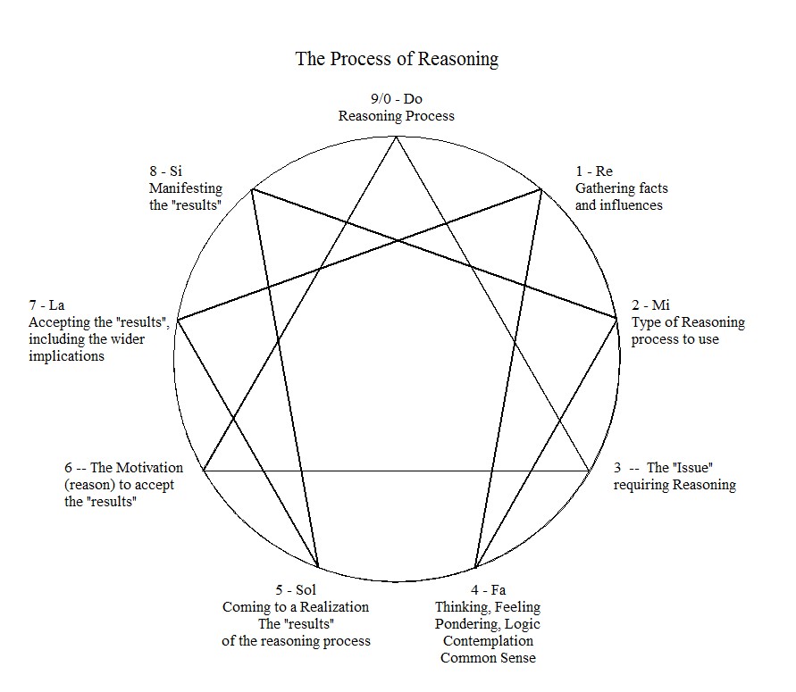 I was out cutting up tree limbs today when a sudden shower sent me running for cover. As I sat there enjoying the cold wind and rain I took the opportunity to once again contemplate the octave of Reason. Suddenly a very different octave of the Reasoning process emerged and almost immediately morphed into an enneagram of reasoning.